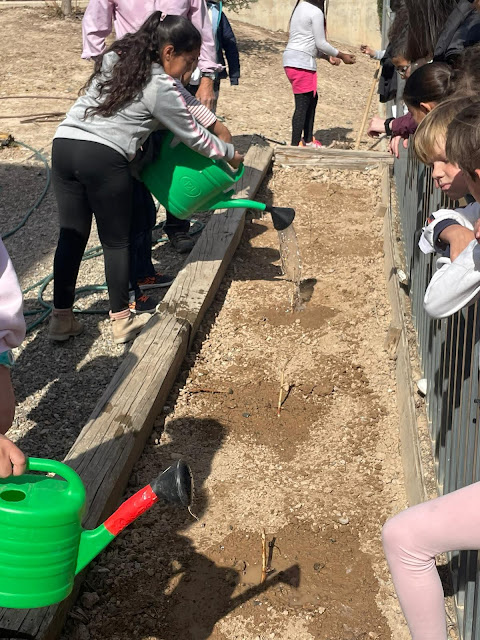 El miércoles 23 de marzo, el alumnado de 3º de primaria disfrutó de una cálida mañana en el huerto y  con la ayuda de Ángel Mari y Mario plantaron sarmientos de parra en la zona cercana a la entrada del huerto.